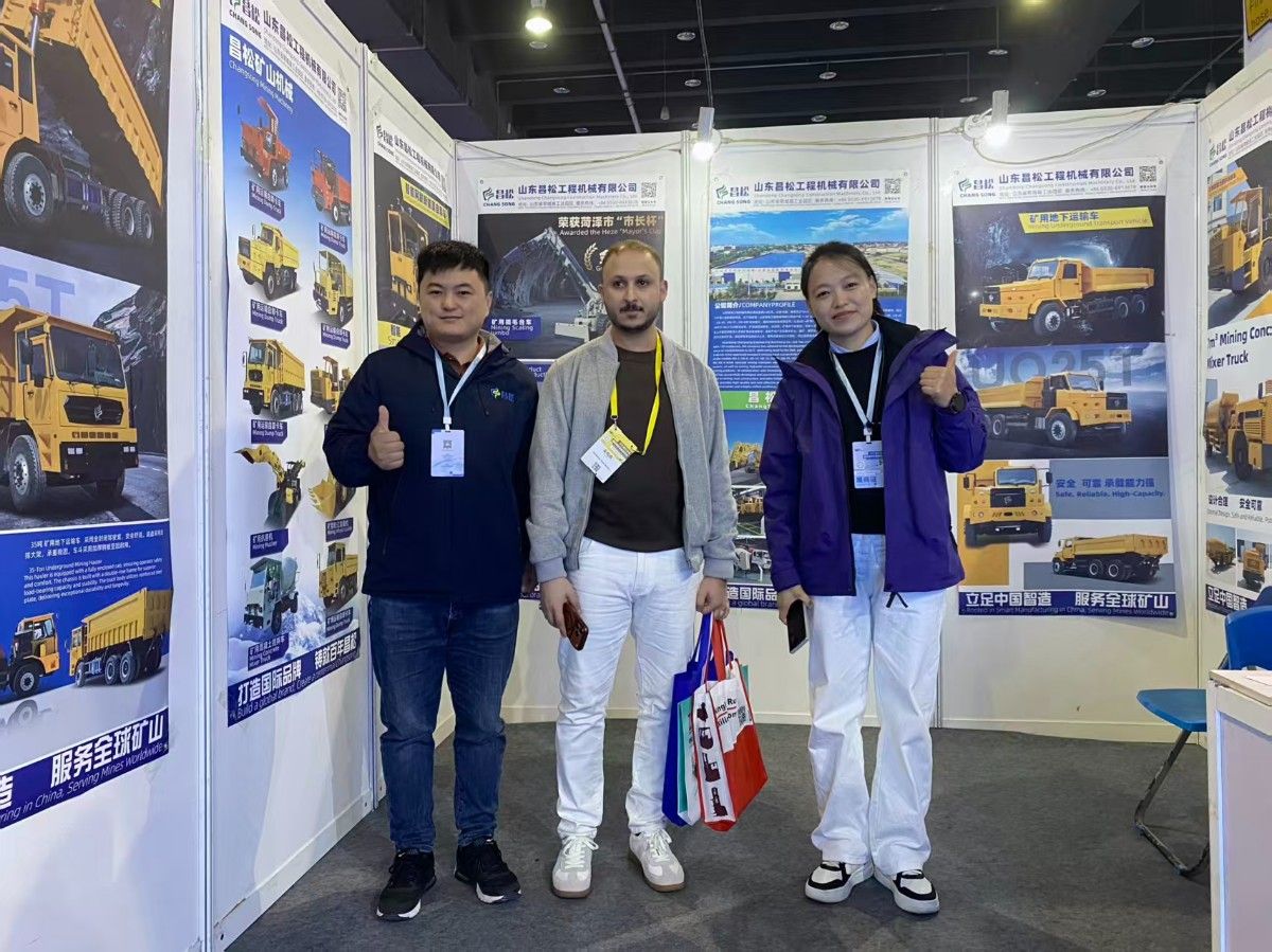 展會現(xiàn)場超熱鬧,山東昌松工程機械的展位前,中外客戶都來點贊。背景里的產(chǎn)品海報特吸睛,展示的工程機械性能強、技術(shù)新。